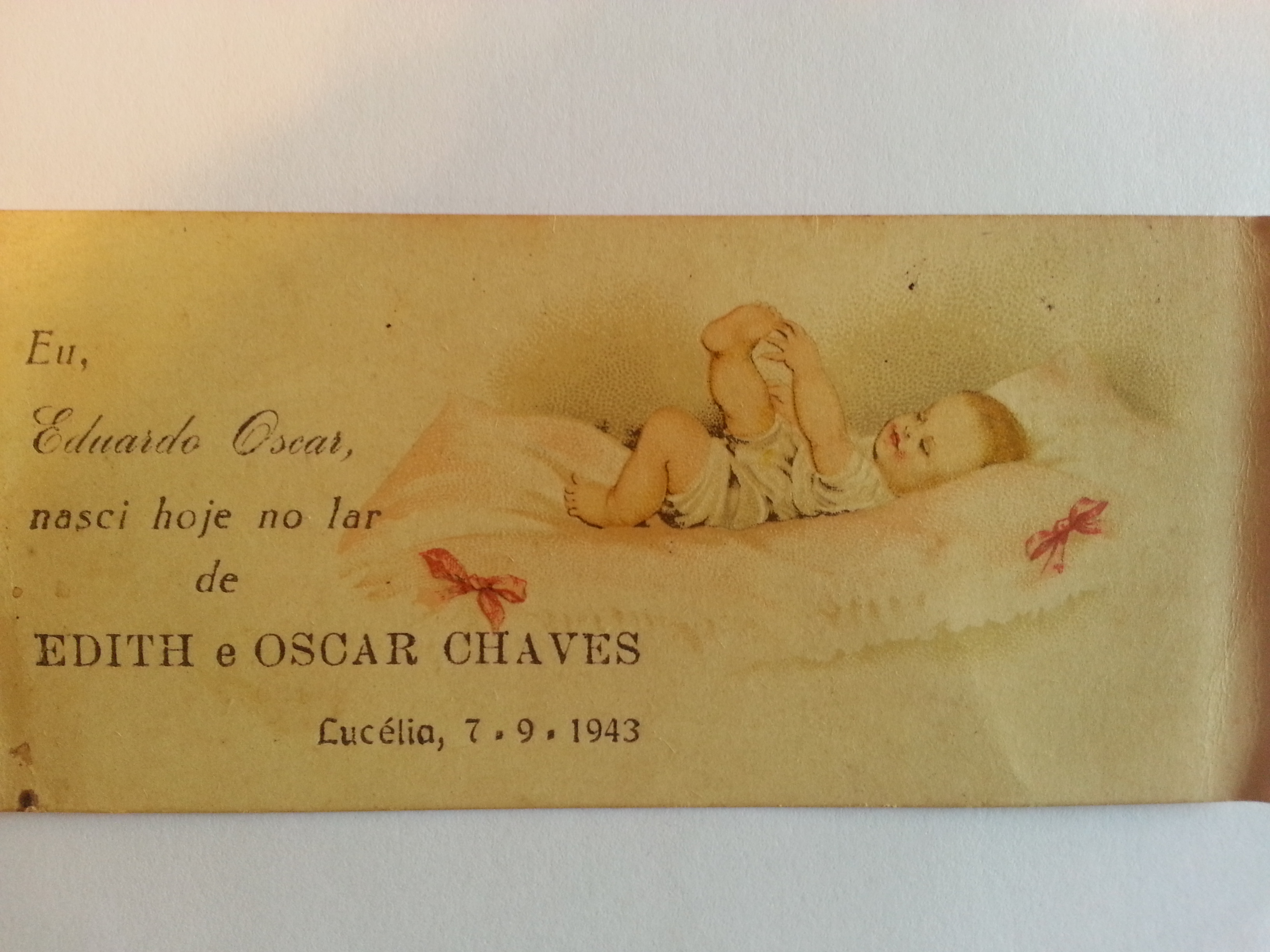 Um cartãozinho, de praxe, foi impresso, com o desenho de um nenezinho segurando o dedão do pé, e os dizeres: “Eu, Eduardo Oscar, nasci hoje no lar de EDITH e OSCAR CHAVES. Lucélia, 7-9-1943″.